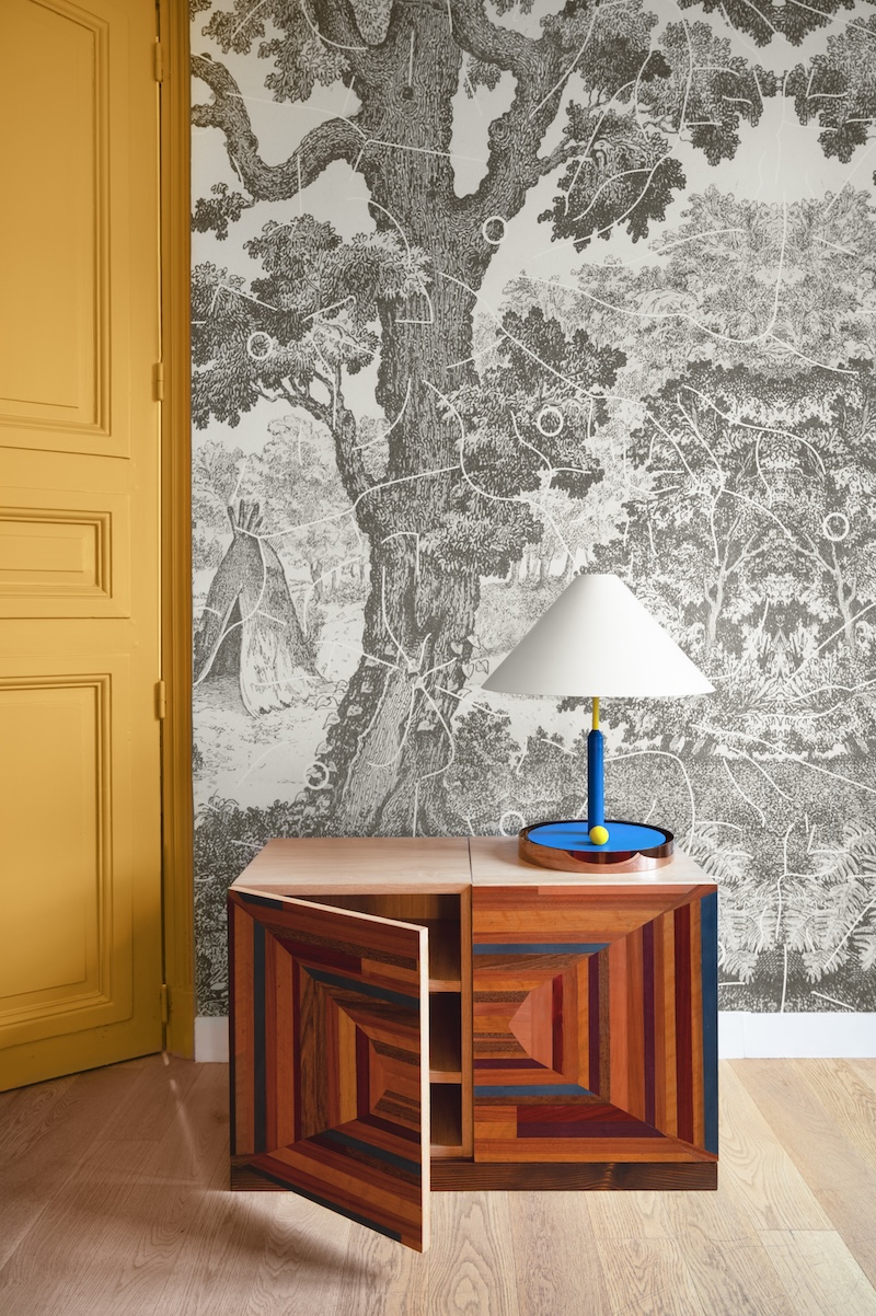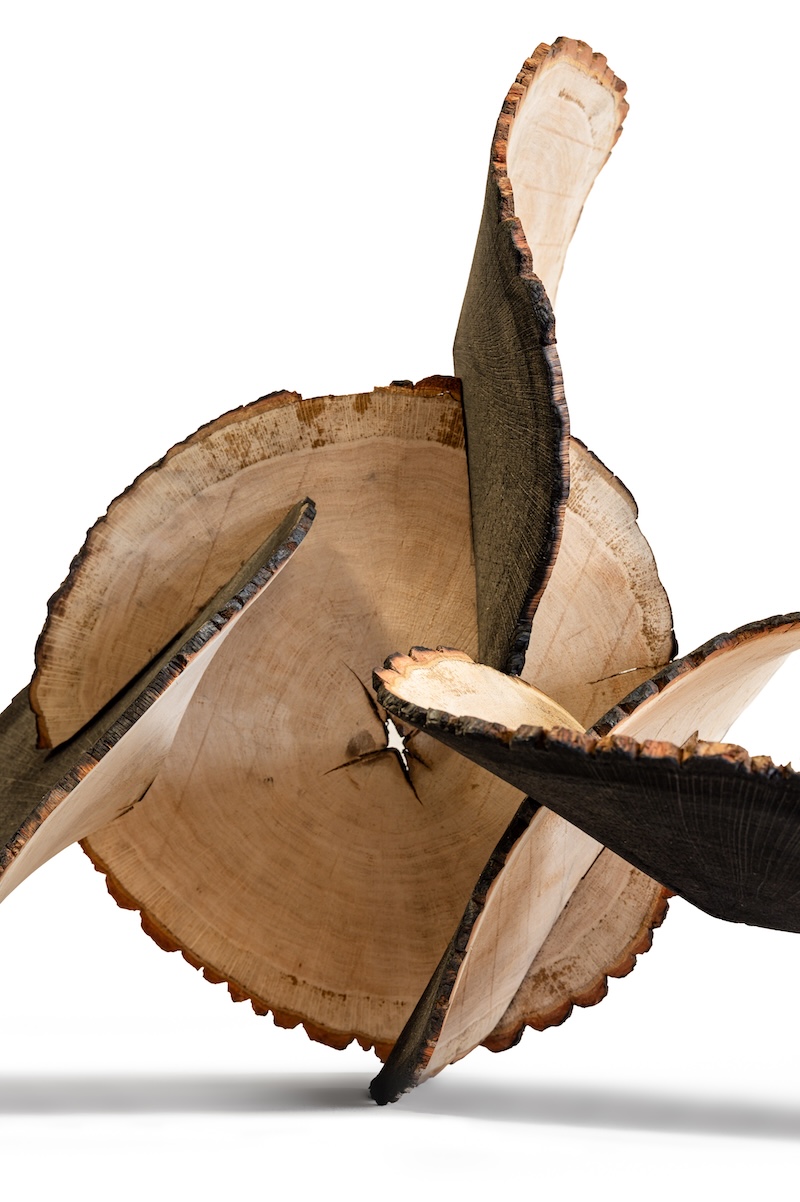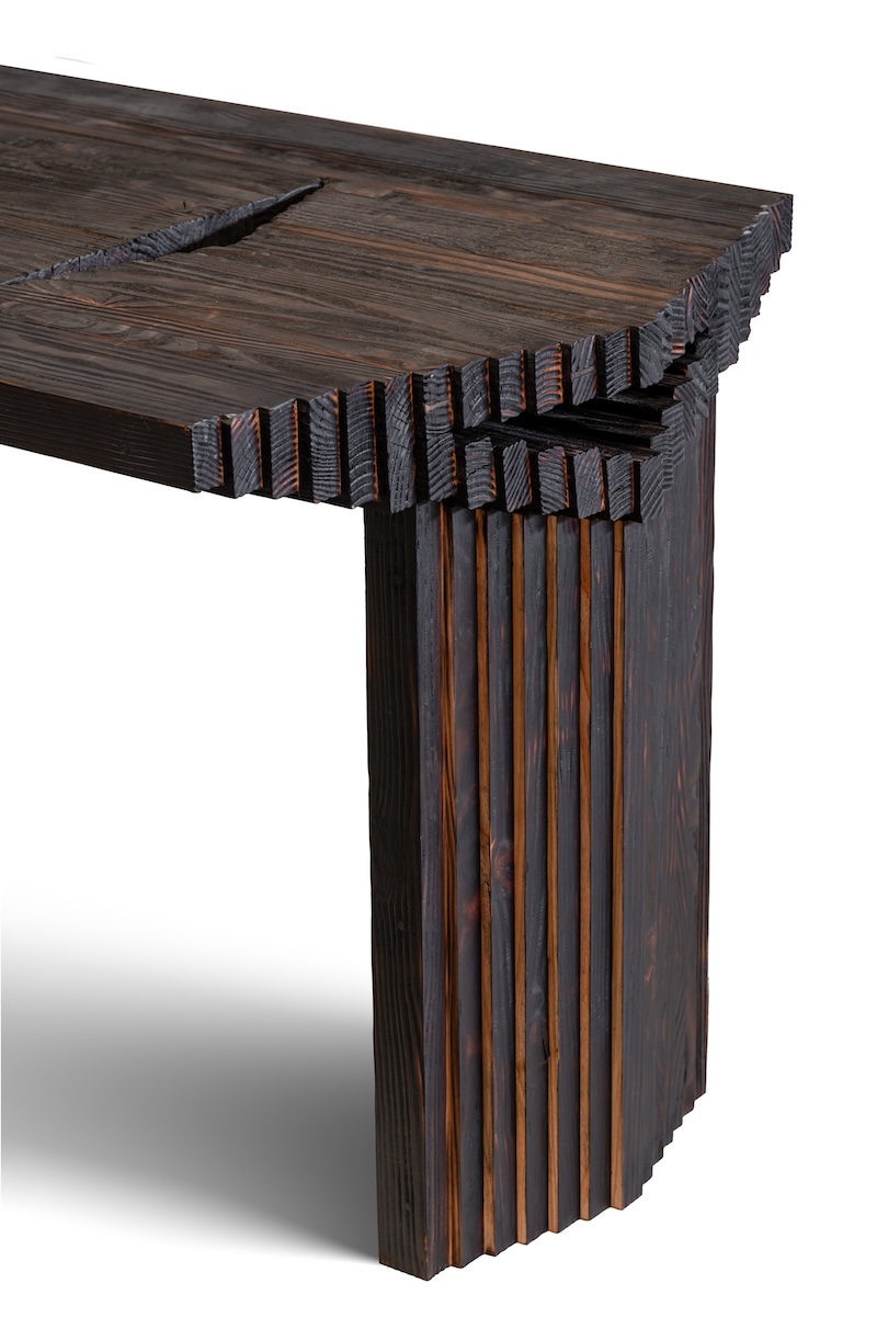 Among the works developed was a dining table by Doha-based designer Aia Zaina, who used the Japanese technique of yakisugi – a technique for preserving wood by charring its surface – with Douglas fir sourced from Burgundy. Through burning, brushing, stretching and scoring she created more than a hundred surface variations. “The table becomes an embrace of culture and imperfection,” she says. “Its function is not only understood as usefulness, but as a celebration of dialogue.”