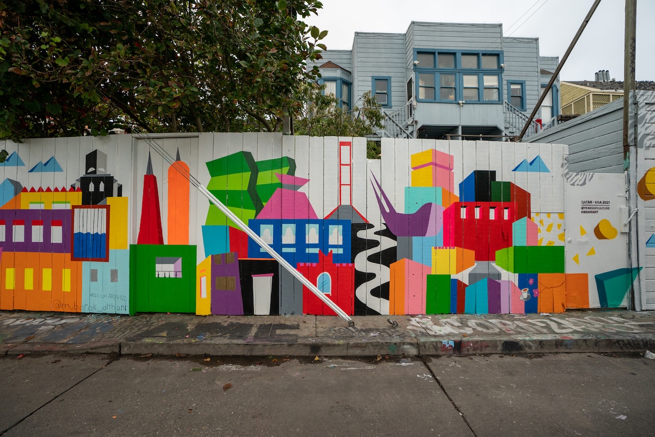 Qatari artist Mubarak Al Thani collaborated with Wes Wong to create Mission 974, a mural merging the skylines of San Francisco and Doha at the 24th Street and Mission Street BART Plaza Station. The project was a partnership with Mission Art 415.
