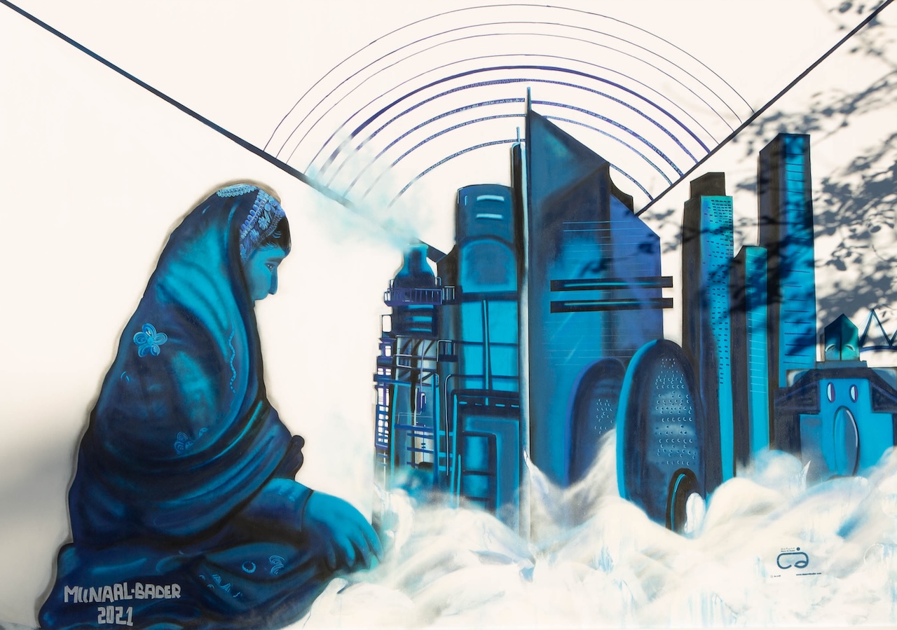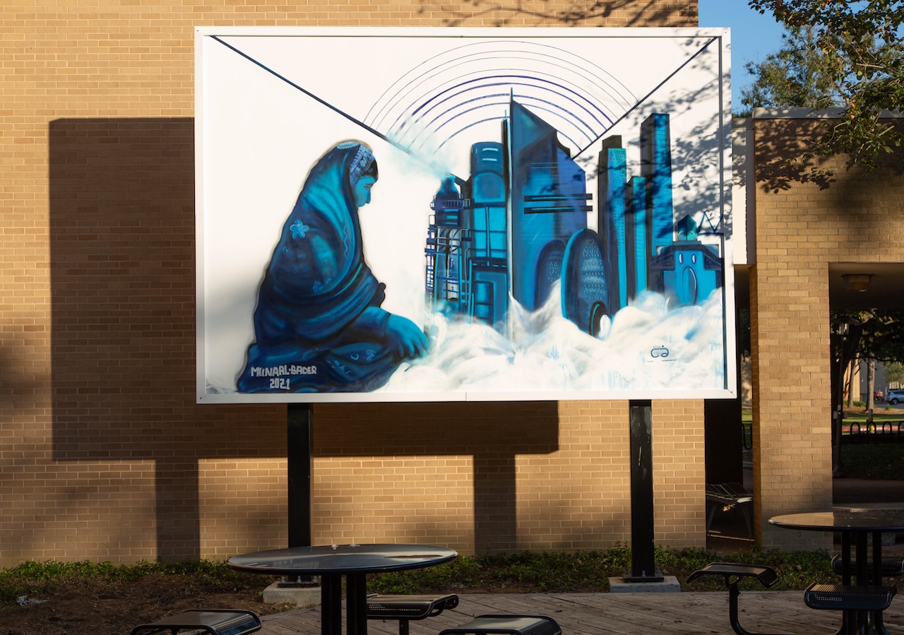 Muna Al-Bader painted Cultural Bonds, a mural at the University of Houston campus that illustrates half a century of cultural ties and diplomatic relations between the US and Qatar. In the work, a young girl wearing traditional Arab attire admires the merged skylines of Houston and Doha.