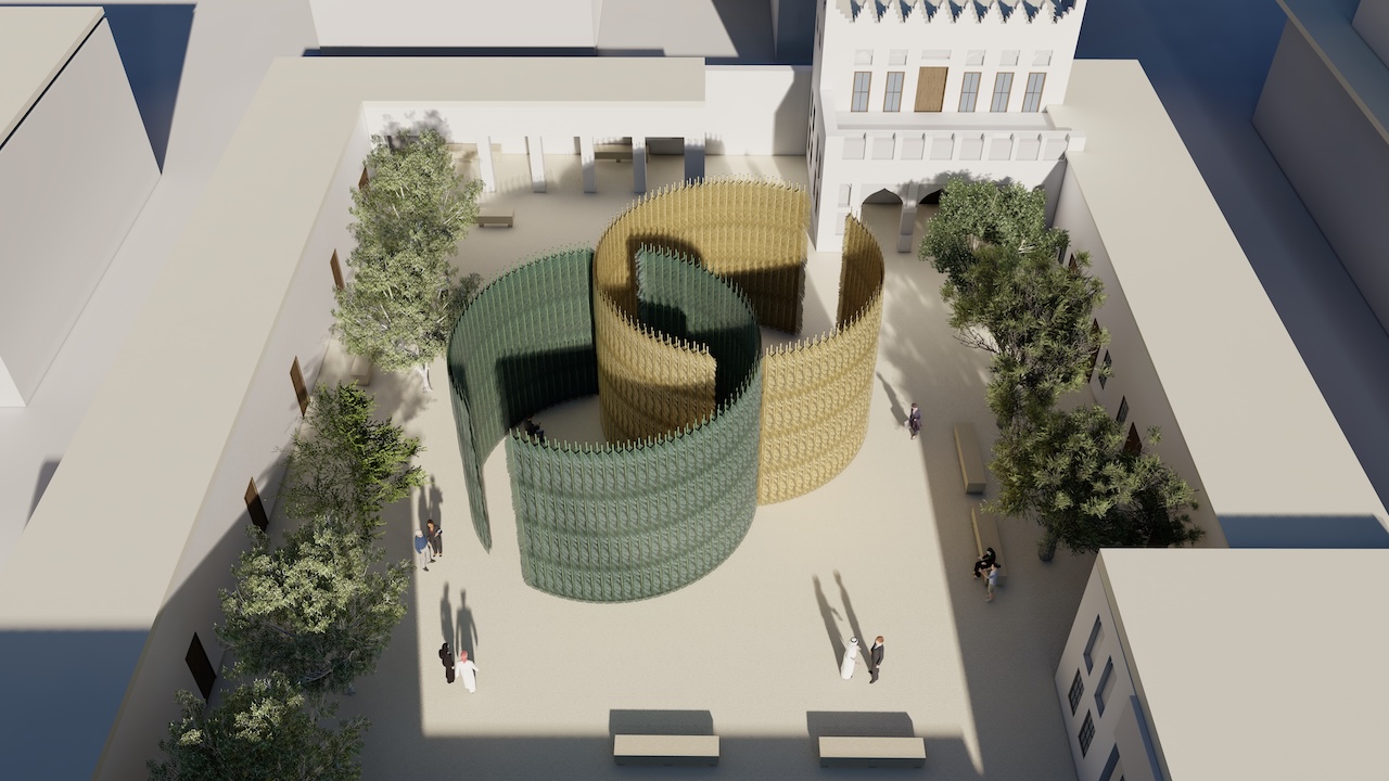 Lebanese artist Rayyane Tabet’s experiential pavilion What Dreams May Come | أيُّ أحلامٍ قَدْ تأتي explores the theme of Becoming through the suspended state of dreaming. Formed by two intersecting circular structures clad in natural and artificial palm fronds, the installation recalls the simple gesture of resting beneath a palm tree – an archetype of shelter across the Gulf. The pavilion invites both gathering and introspection, offering a transformative spatial encounter.