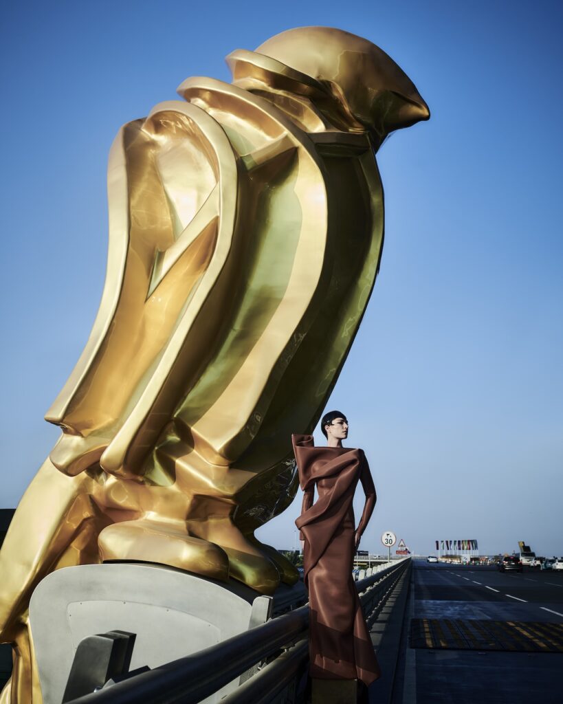 It’s always emotional for me leaving Qatar – and the Falcon statue at HIA is one of the last things you see. I wanted to pay tribute to that experience and Qatar’s national bird. The dress I’ve created is very sculptural and architectural. I used the shiny side of the fabric so the dress feels like it’s cast in bronze and resembles an ancient statue. It feels very powerful and has a highlight on one shoulder that evokes the way a bird might perch on a falconer’s shoulder.