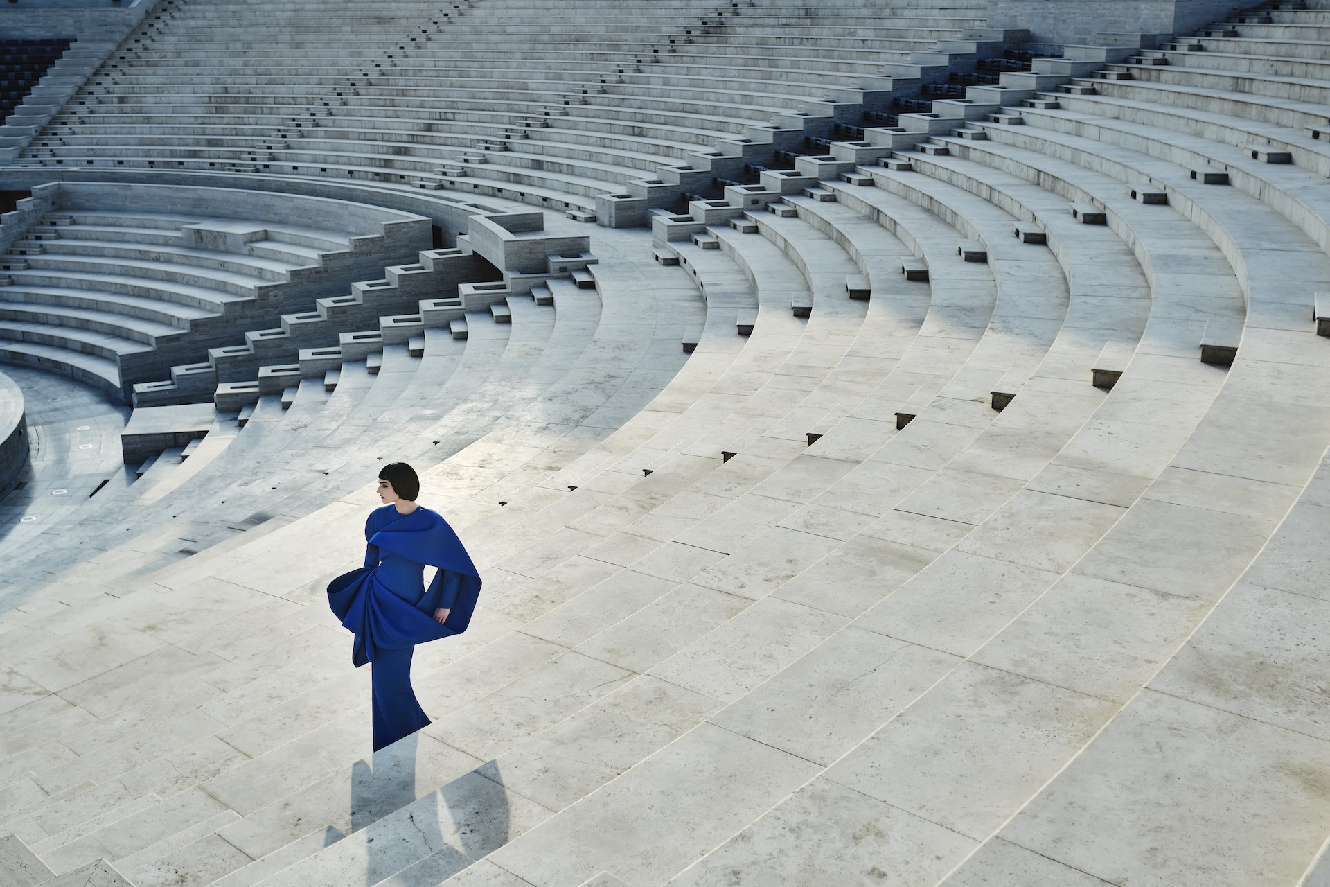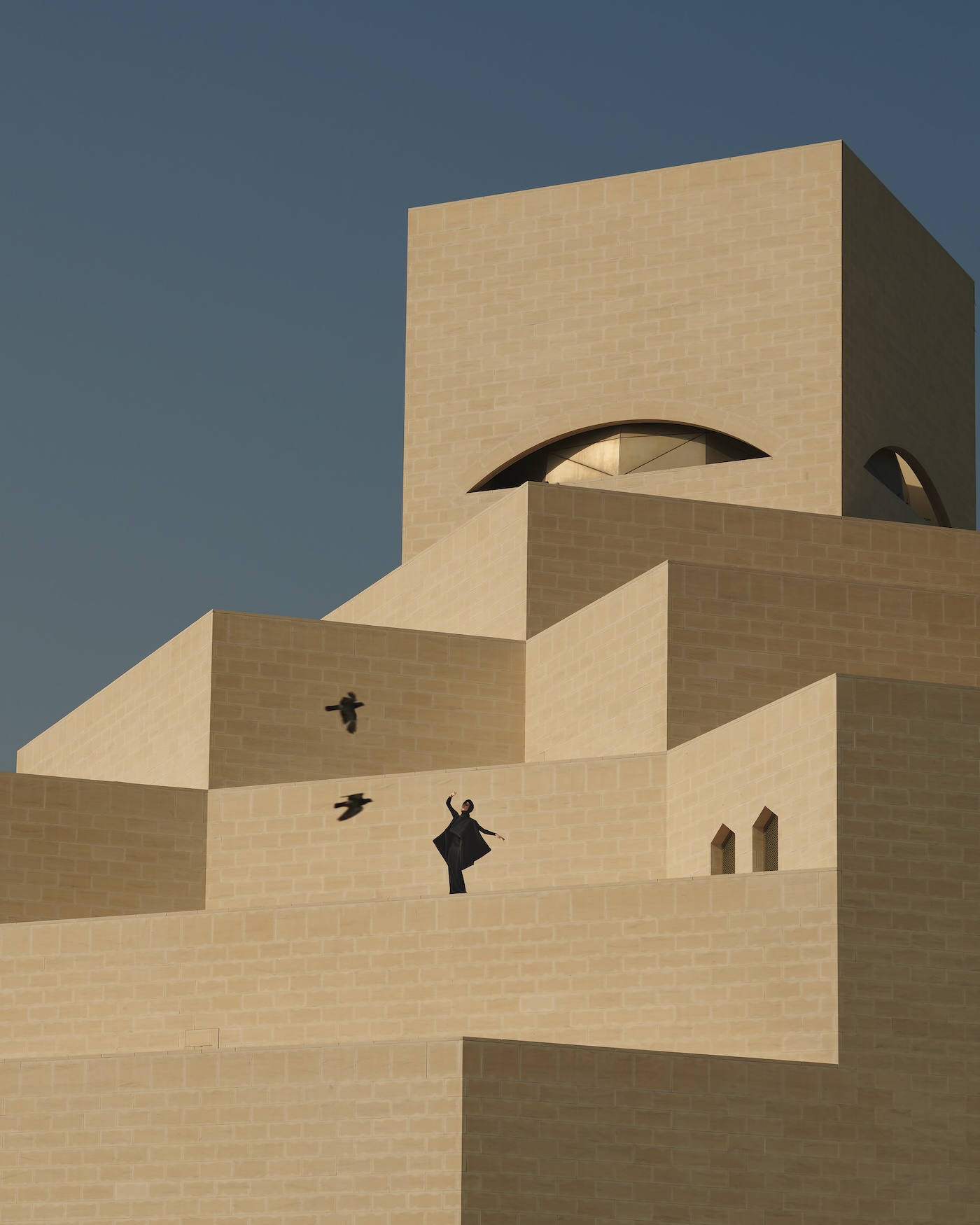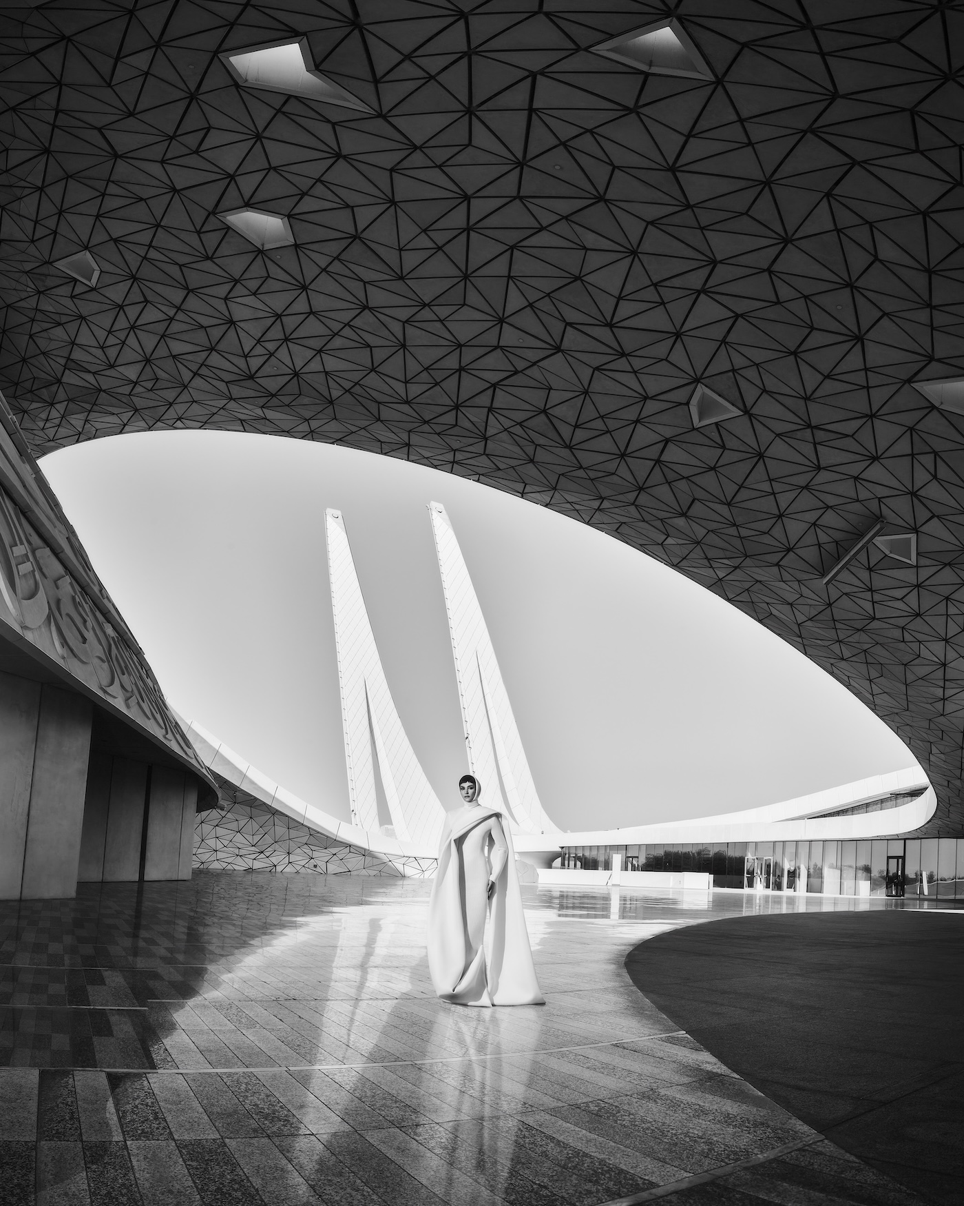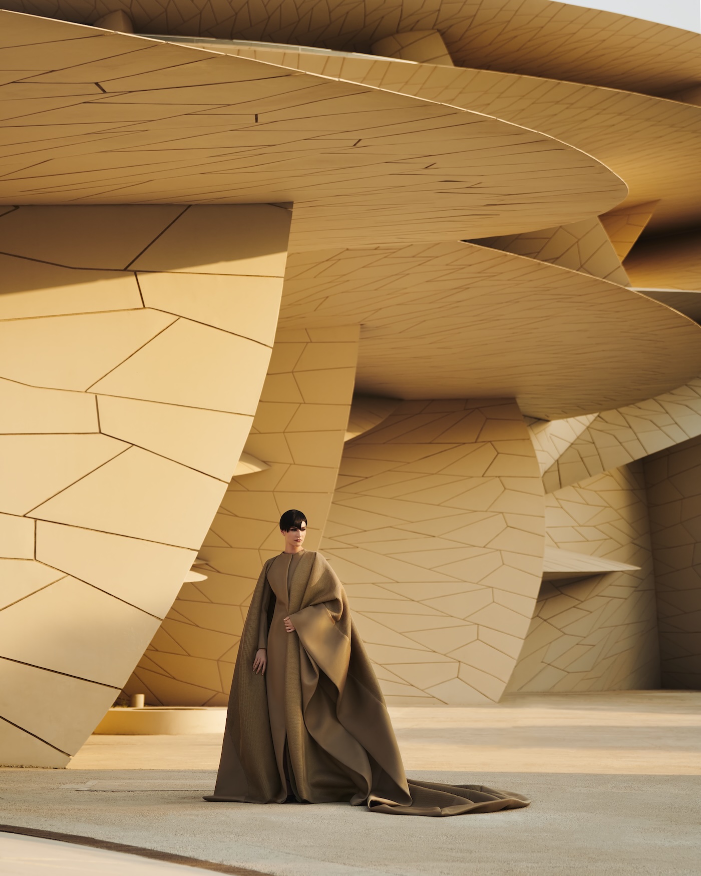 The Museum of Islamic Art is a masterpiece by architect IM Pei that draws inspiration from Muslim architecture and history. The geometric shapes of the building are reflected in this dress, with flowing, feminine cubic forms – particularly at the back. When the falcon appeared in the shot, it was so magical. It felt like a symbolic moment for the whole collection.