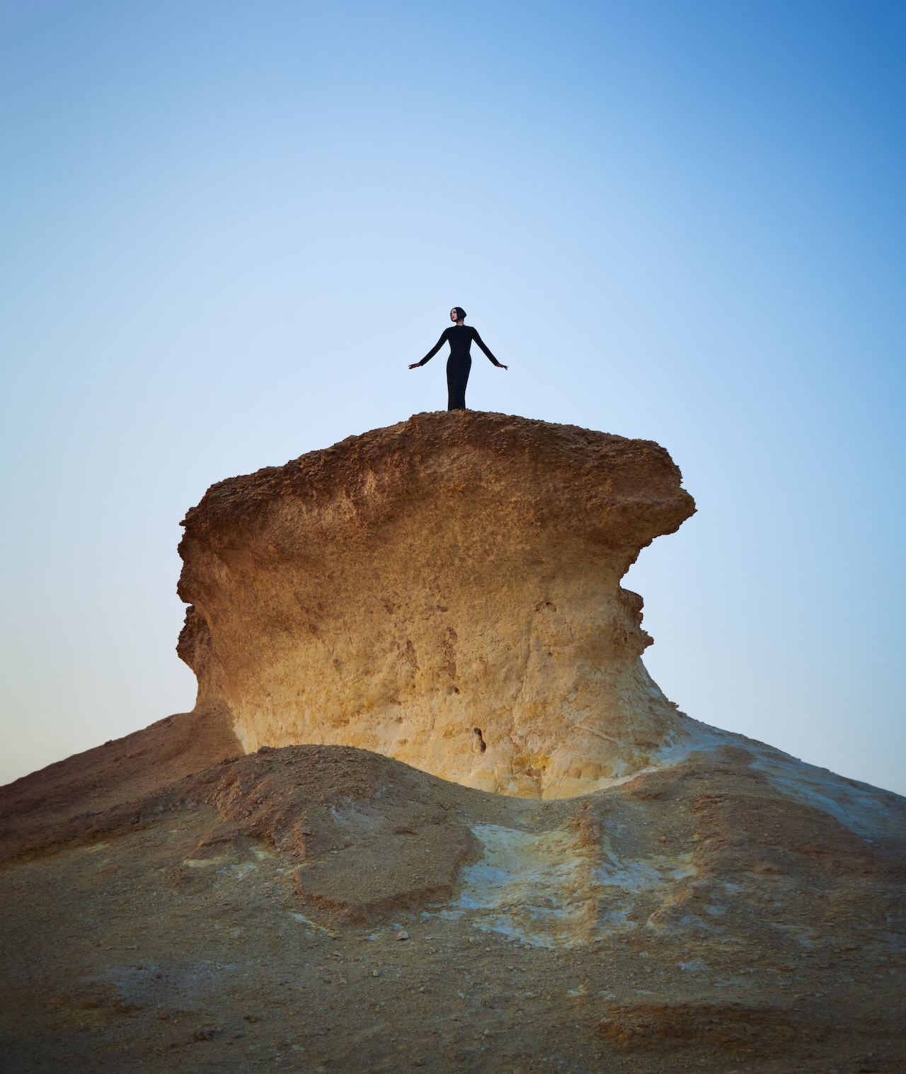 This was the very first piece I created for the collection – a simple bodycon dress that became the foundation for everything that followed. Every sculpture was draped around this base. I wanted to photograph it here, in this beautiful landscape near the Richard Serra installation in the Brouq Nature Reserve, to reflect the purity of both the landscape and the form.