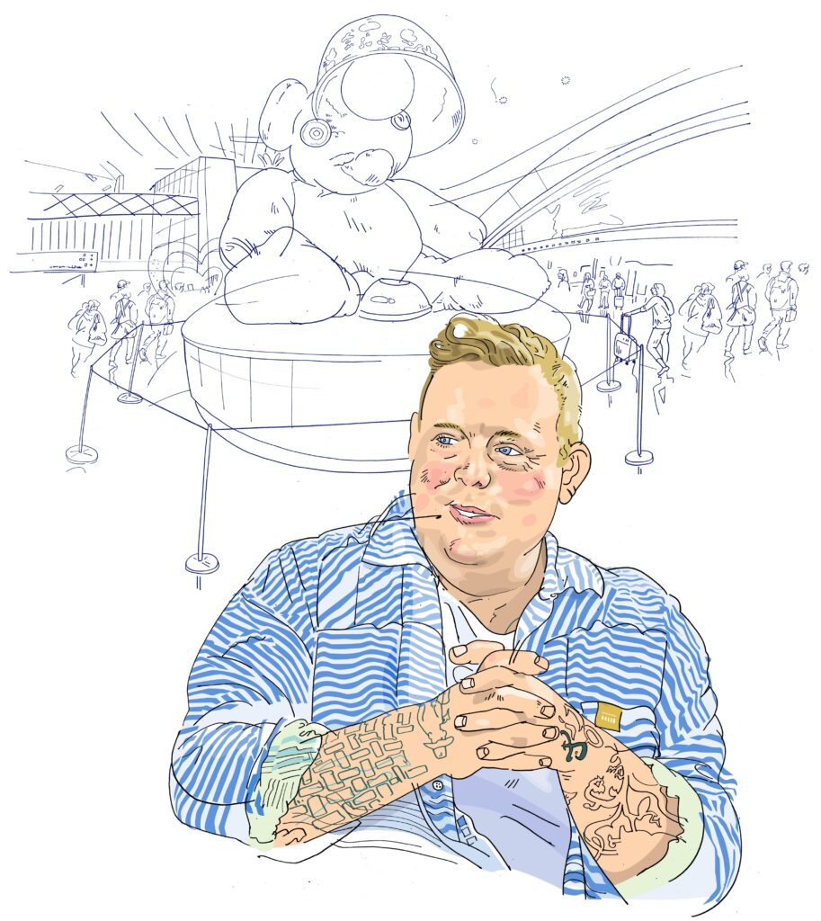 URS FISCHER Well, it didn’t start as a public sculpture intended for such a busy place. That was the Sheikha’s vision, not mine. It came out of a far smaller thing. You know when you have a torch and you shine it up in your face – it can look scary or kind of cute. That’s where the initial idea came from. Then that bear I created started to grow and it became a much bigger object. Then I thought it should be in a city. Eventually it landed up at the airport, where it has a more landmark-y function. When you have the seed of an artwork you don’t really know what it is. Then it goes from this little seed and if it’s successful it can expand. It’s like the Sydney Opera House – it started with somebody being obsessed about some small idea or vision. If the idea is successful, it can become a landmark.